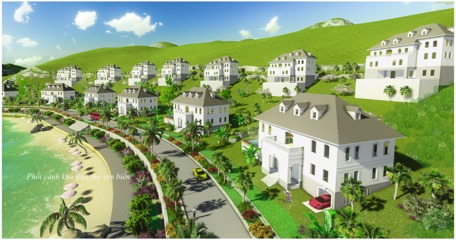 + Khu biệt thự sinh thái hướngbiển được xây dựng theo triền dốc tự nhiên, tất cả điều có tầm nhìn đẹp ra biển. Về hình thức kiến trúc: mô típ kiến trúc nhà mái hai sườn dốc hoặc nhiều sườn dốc tạo không gian hài hòa với cây xanh sinh thái bảo tồn xung quanh, sử dụng công nghệ hiện đại thể hiện trong kiến trúc mô phỏng kiến trúc dân gian địa phương, gây được ấn tượng cho du khách về tính đặc trưng bản địa khi khách tham quan du lịch nhìn từ phía biển vào.